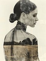 Bijzonder portret, digitale double exposure collage. In dit werk zie je het portret van een jonge vrouw gecombineerd met een landschap. Een echte blikvanger voor je interieur!