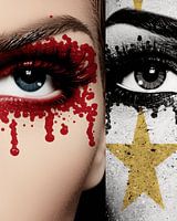 Bijzondere close-up van twee ogen in zwart, wit, geel en rood. Kies zelf het formaat en materiaal bij dit werk en maak het helemaal passend voor jouw interieur. Dit is een echte blikvanger.