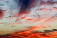 Bijzondere lucht met rode wolken na zonsondergang met twee vogels.