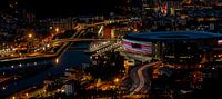 een avondopname van de skyline van de Spaanse stad Bilbao