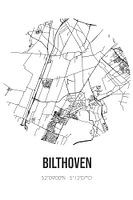 Zwart-witte landkaart, stratenplan of plattegrond van Bilthoven. Bilthoven is gelegen in de gemeente De Bilt, provincie Utrecht. Op de stadskaart zijn alle openbare wegen in Bilthoven opgenomen. Verder is de kaart voorzien van de coördinaten van het centrum van Bilthoven.