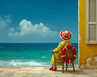 Deze levendige kunstfoto toont een vrouw in een rode jurk met gele details zittend bij een felgele deur aan het strand. Ideaal voor liefhebbers van kleurrijke kunst, strandfotografie en…