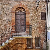 Een donker en schaduwrijk hoekje van een straat binnen de stadsmuren van Panicale, een middeleeuwse ommuurde heuvelstad in Umbrië, Italië. Dit is een prachtige blik op de traditionele Italiaanse architectuur met een stenen gebouw, marmeren trappen naar een houten deur in traditionele stijl. Metaalwerk is aanwezig, zowel in de leuningen op de trap als in de raamroosters met lage ramen die een kelder of lagere verdieping suggereren. Zoals altijd zijn er regenpijpen, bijna altijd krom! Fotokunst.