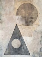 Een driehoek, een cirkel, een vierkant — maar niets is scherp. Alles lijkt doorgelicht, vervaagd, als resten van vormen die net zichtbaar blijven. De compositie blijft beheerst, ondanks de strakke geometrie.