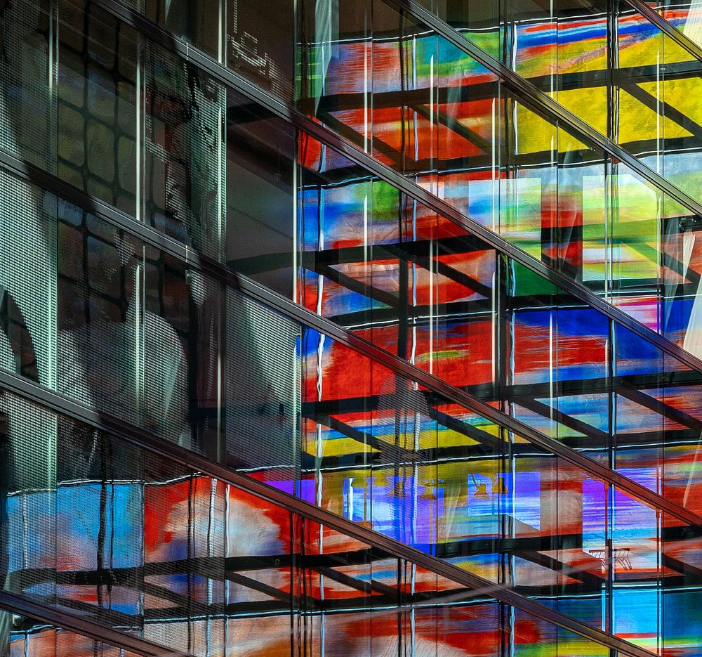 De kleurrijke glazen binnen gevel van het museum Beeld en Geluid in Hilversum.
