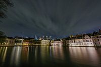 Groothoekfoto van het Haagse Binnenhof met de Hofvijver. Het huisvest de ontmoetingsplaats van beide huizen van de Staten-Generaal van Nederland, evenals het ministerie van Algemene Zaken en het kantoor van de Eerste Minister van Nederland. Het Binnenhof is de zetel van het Nederlandse parlement en het architectonische symbool van de stad.