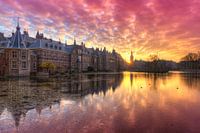 Het Torentje en Binnenhof weerspiegeld in Hofvijver tijdens zonsondergang