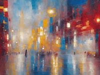 Stap in de levendige wereld van abstracte kunst met dit adembenemende schilderij van een binnenstad, waarin de kleuren rood,