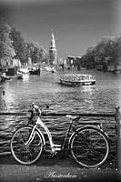 Binnnenstad uitvoering van de Oudeschans met de Montelbaantoren en NEMO op de achtergrond. De "oude" fiets, niet electrisch en (rondvaard) boten.