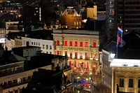 Zicht op de Winkel van Sinkel aan de Oudegracht vanaf de Domtoren in Utrecht. Rechts zie je het stadhuis, recht achter de Winkel van Sinkel zie je stadskasteel Oudaen.