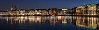 Na zonsondergang met uitzicht op de bevroren Binnenalster in Hamburg