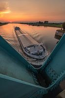 In de kalme avondgloed strekt het Amsterdam-Rijnkanaal zich uit als een spiegel naar de horizon, waar een bescheiden stipje van de zon de wereld vaarwel zegt. Te midden van deze serene schoonheid beweegt een binnenvaartschip majestueus over het water, badend in het warme licht van de zonsondergang. Het schip lijkt bijna te stralen te midden van de gouden reflecties op het water en rond het schip dansen de scheepsgolven.