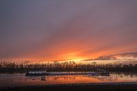 In de kalme avondgloed van een schilderachtige zonsondergang glijdt een binnenvaartschip sierlijk over het kanaal. Het water weerspiegelt de kleuren van de ondergaande zon, waardoor het schip lijkt te zweven op een pad van vloeibaar goud. De lucht is doordrongen van warme tinten, variërend van zachte oranjes tot diepe…
