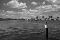 Een stoer binnenvaartschip varend op het IJ in Amsterdam. Op de achtergrond het Centraal station dat fraai afsteekt tegen een geweldige Hollandse wolkenlucht.