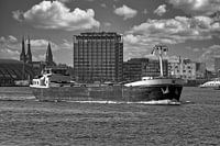 Een stoer binnenvaartschip varend op het IJ in Amsterdam. Op de achtergrond het Centraal station dat fraai afsteekt tegen een geweldige Hollandse wolkenlucht.