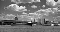 Een stoer binnenvaartschip varend op het IJ in Amsterdam. Op de achtergrond het Centraal station dat fraai afsteekt tegen een geweldige Hollandse wolkenlucht.