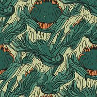 Das Bild mit dem Titel „Organic Greens“ zeigt eine üppige, abstrakte Komposition, die von botanischen Formen und natürlichem Wachstum inspiriert ist. Die Oberfläche ist von Rand zu Rand mit sich wiederholenden organischen Formen gefüllt, die stilisierten Blättern, Samenkapseln oder Blütenknospen ähneln und zu einem nahtlosen Muster…