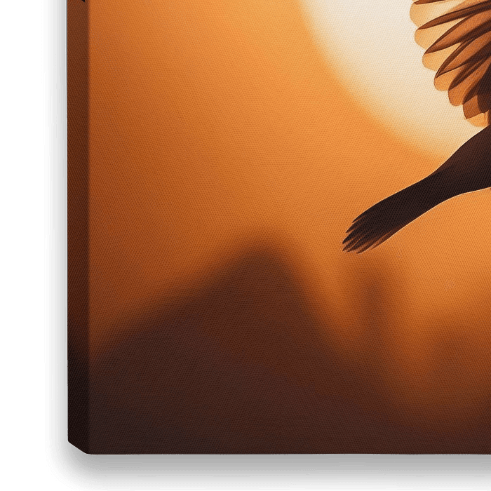 Dit expressieve werk toont een majestueuze vogel die krachtig voor de ondergaande zon vliegt. De vurige zonnestralen contrasteren prachtig met de silhouetachtige vogel, wat een gevoel van vrijheid en avontuur oproept. De warme kleuren en dynamische compositie maken het een blikvanger in elke ruimte.