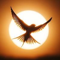 Dit expressieve werk toont een majestueuze vogel die krachtig voor de ondergaande zon vliegt. De vurige zonnestralen contrasteren prachtig met de silhouetachtige vogel, wat een gevoel van vrijheid en avontuur oproept. De warme kleuren en dynamische compositie maken het een blikvanger in elke ruimte.