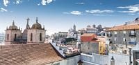 Stadsgezicht van Porto, Portugal, met op de voorgrond dak van kerk met twee torens en in ee achtergrond wijk met oude huizen tegen een blauwe lucht.