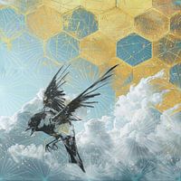 Dit kunstwerk toont een dynamische compositie met een vogel die lijkt te zweven in een lucht vol met wolken, onder een achtergrond van gouden zeshoeken. De zeshoekige vormen voegen een abstract geometrisch element toe, dat contrasteert met de organische vormen van de vogel en de lucht. De vogel is in een schetsachtige stijl weergegeven, met zwarte en grijze tinten, wat een rauwe energie geeft aan het beeld. De gouden, met lijnen versierde zeshoeken stralen luxe uit, terwijl de lucht en de wolken een serene en dromerige sfeer creëren.