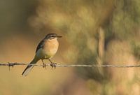 Gele kwikstaart op prikkeldraad langs een weiland.