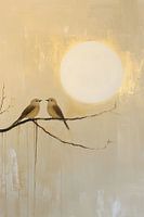 Afbeelding van twee vogeltjes verliefd zittend op een tak met een wit gouden zon. Achtergrond is beige, de vogeltjes zelf zijn bruin met beige. Fragiel en lieflijk. Uitlopers van verf naar beneden. Natuur. Landelijk.