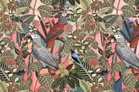 Collage van diverse soorten vogels, op een achtergrond met pastelkleuren.