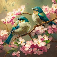Schattig koppeltje vogels op een tak met kersenbloesem. A la Van Gogh maar dan een beetje anders. Kleurrijk en verfijnd.