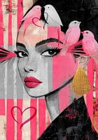 Mixed media afbeelding in pop art stijl van een vrouw met indringende blik. In haar zwart haar zitten twee koppeltjes verliefde roze vogeltjes. Liefde wordt gesymboliseerd door de diverse hart figuurtjes in de afbeelding. Haar wimpers worden extra kracht bijgezet door de roze en zwarte extravagante vormen vlak bij haar wimpers. Ze draagt een zwarte jurk. De achtergrond is beige met roze strepen. Samen maakt het een intrigerend geheel dat boeiend is om naar te kijken. Organische vormen samen met strakke lijnen. Pop art. Mixed Media. Roze. Neon. Goud. Modern Abstract.