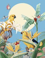 Een tropisch landschap met vogels, planten en vlinders, op een blauwe achtergrond.