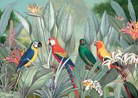Voor het laten afdrukken op canvas, hout, behang of doek verwijs ik u graag naar mijn kunstwerk “Birds in Paradise” (code 655054 ). Dat is hetzelfde tafereel als waar u nu naar kijkt, maar dan zonder het diepte effect, waardoor het werk een meer vintage en retro uitstraling heeft.