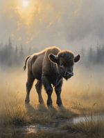 Dit werk toont een jonge bizon in het vroege ochtendlicht, staand in een open landschap waar mist en zonlicht elkaar voorzichtig ontmoeten. De lucht gloeit zacht, het land is stil, alsof de wereld nog niet besloten heeft te bewegen. Alles in deze compositie ademt rust, ruimte en het begin van draagkracht.