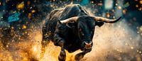 Een krachtige stier stormt door een dynamische scène, omringd door een zee van stof en licht. Zijn geprononceerde hoorns en gespierde gestalte stralen energie en woestheid uit die elke kijker boeien. Dit beeld brengt levendigheid in elke woonkamer en wordt het middelpunt van levendige gesprekken en inspirerende momenten.