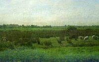 Vrij uitzicht op groene uitgestrekte Friese landerijen, zo ver het oog kan kijken. Grazende schapen en boerenslootjes. Verloren groepjes bomen of struiken. Weidse groene vlakte.