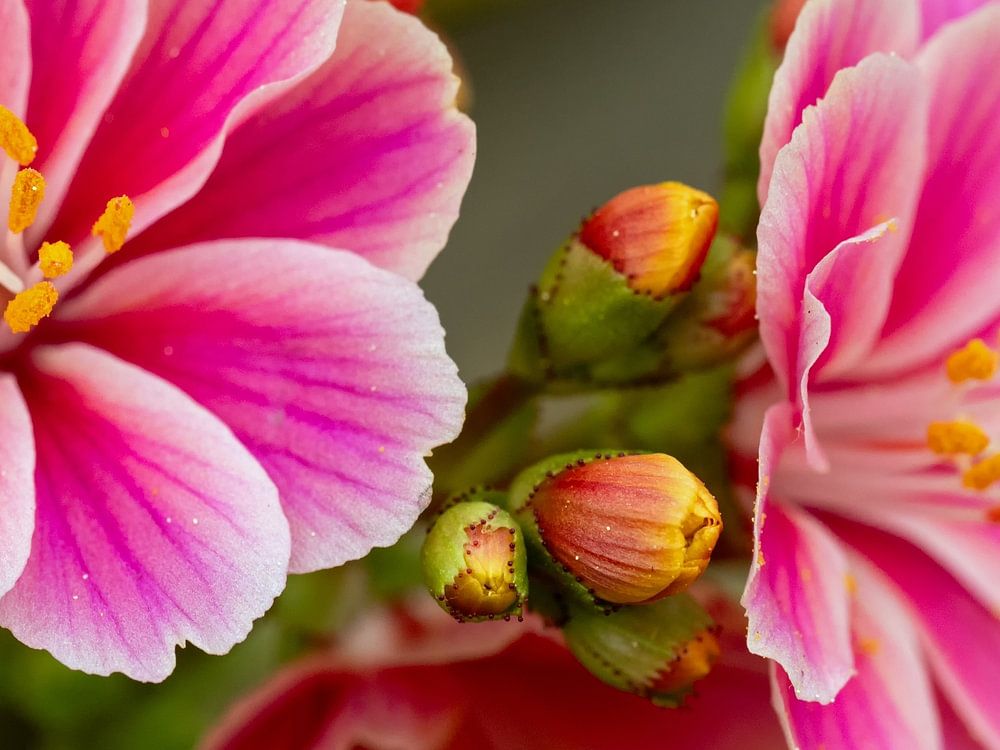 Close-up van het bladrozet en een veelheid aan roze bloemen van de bitterwortel (Lewisia cotyledon), ook wel bekend als porseleinroosjes.