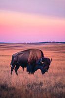 Een uitgestrekt graslandschap strekt zich uit in de zachte schemering, terwijl een majestueuze bizon met zijn prachtige, pluizige vacht de stilte van de natuur verbreekt. De warme kleuren van de zonsondergang omlijsten zijn imposante silhouet, dat in zijn kracht en rust de ongerepte uitgestrektheid van het land belichaamt. Een aanblik vol oerkracht en gratie.