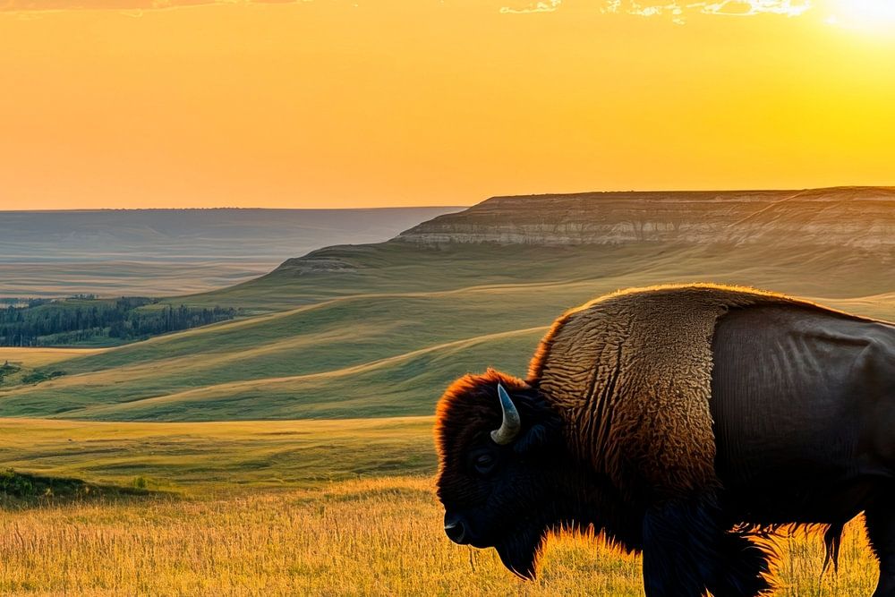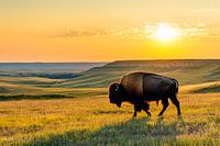 Een majestueus dier zwerft door de uitgestrekte graslanden terwijl de zon achter glooiende heuvels in een warme gouden tint ondergaat. Het silhouet van de bizon steekt opvallend af tegen de stralende lucht en zijn krachtige lichaam straalt oerkracht uit. Deze scène belichaamt de ongerepte schoonheid en majestueuze rust van de natuur.