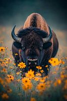 De majestueuze bizon troont temidden van een heldere bloemenzee, met zijn krachtige lichaam en indrukwekkende, fluweelachtige manen. De diepbruine tinten harmoniëren met het stralende geel van de bloemen, terwijl de krachtige hoorns trots de lucht in steken. Zijn spookachtige ogen stralen een woeste kalmte uit, alsof hij de bewaker is van dit bloeiende landschap.