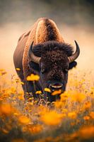 Een majestueuze bizon graast te midden van helder gouden bloemen. Zijn wilde uitdrukking en krachtige horens geven hem een indrukwekkende aanwezigheid. Het zachte licht omhult hem en creëert een harmonieuze verbinding tussen dier en natuur, terwijl de bloemenaccenten het moment versterken met een vleugje wilde romantiek.