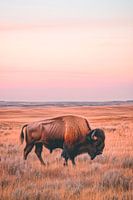 In de zachte schemering steekt een majestueuze buffel de eindeloze uitgestrektheid van de prairie over. Zijn krachtige lichaam steekt indrukwekkend af tegen de pastelkleurige lucht, terwijl het gouden gras zachtjes wiegt in de wind. Een scène die de rust en de ongetemde schoonheid van de natuur belichaamt en de geest van de wildernis opwekt.