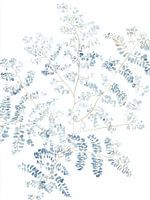 Verfijnde en luchtige weergave van takken met kleine blaadjes, uitgevoerd in zachte blauwtinten die variëren van licht pastel tot dieper indigo. De takken zijn sierlijk verspreid over het witte vlak, waardoor er een transparante en bijna aquarelachtige uitstraling ontstaat. De fijne lijnen en subtiele kleurverloopjes zorgen voor een…
