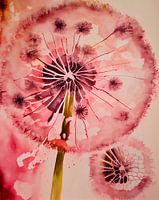 Afbeelding van surrealistische blaasbloemen in roze bruine kleurstelling. Pluisjes waaien in de lucht. Verfijnd en kleurrijk. Passend bij diverse trends en stijlen.