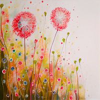 Afbeelding van twee blaasbloemen in een bloemenveld met kleine bloemetjes in pastelkleuren. Abstract en verfijnd. Mooie kleurstelling en verloop. Passend bij diverse trends en stijlen.