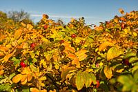 Blåvand duinlandschap in Denemarken aan de Noordzee. Bewolkte hemel met herfstachtig landschap bezaaid met rozenbottelstruiken.