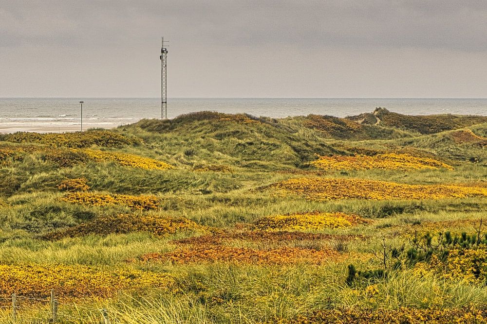 Blåvand duinlandschap in Denemarken aan de Noordzee. Bewolkte hemel met herfstachtig landschap bezaaid met rozenbottelstruiken.