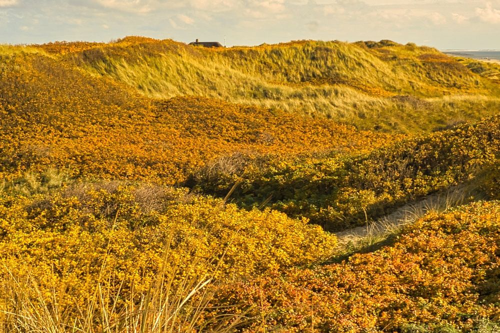 Blåvand duinlandschap in Denemarken aan de Noordzee. Bewolkte hemel met herfstachtig landschap bezaaid met rozenbottelstruiken.