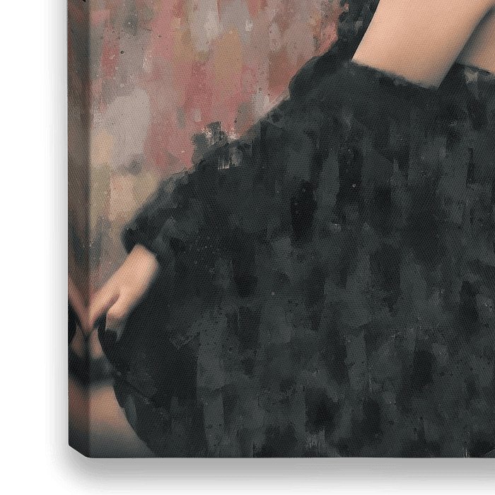 Abstract impressionistisch portret van een jonge vrouw in zwarte jurk. Mixed media schilderij met grove penseelstreken op fijn canvas doek.