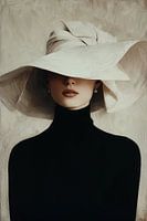 Een porrtet van verfijnde contrasten: een elegante figuur in strakke zwarte coltrui wordt gedomineerd door een weelderige, asymmetrische crèmekleurige hoed die het gezicht mysterieus verbergt. Dit schilderwerk speelt met de spanning tussen verberging en zelfexpressie, waarbij de minimalistische compositie en gedurfde silhouet een…