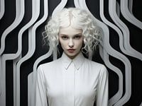 Een foto toont een model gekleed in strak witte kleding. Haar lichtblonde lokken contrasteren tegen een zwart-witte achtergrond met minimalistische vormen. Het contrast benadrukt haar serene schoonheid te midden van ingetogen en krachtige lijnen.